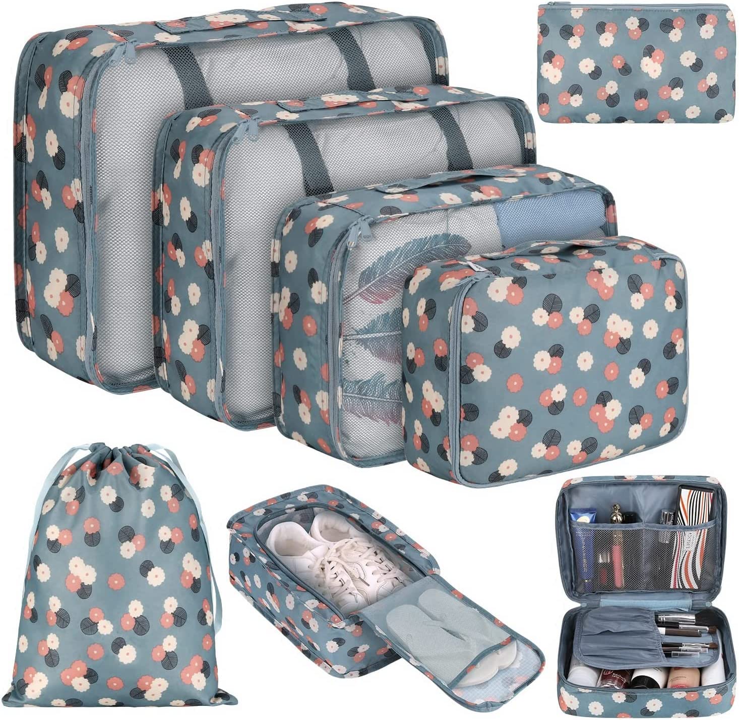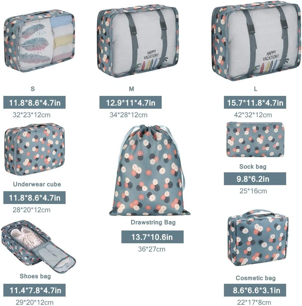 - Super Value Travel Bags Set: Include 3 single travel cubes for clothes, 1 cube for underwear, 1 drawstring bags for dirty laundry and cosmetic, 1 make up bucket bag for cosmetic and toiletries, 1 shoes bag for shoes, 1 small bags for socks, coins, pens, keys etc. They can make your luggage neat and order, make you have a easy, comfortable travel experience.