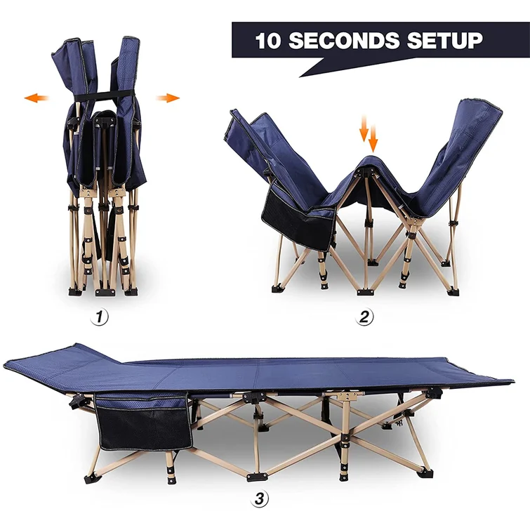 Wide Portable camping Cot is perfect for camping, outdoor grass, forest, indoor bedroom, living room, office, and any place you need to sleep. The sleeping cot for adults is no assembly required, which can be easily installed or folded up into an included storage bag within 10 seconds. Convenient for rest or transport. The thicker oval pipe is adopted to increase the best stability and bearing capacity of the camping bed. The camping cot is made of durable 600D Double Oxford fabric and thicker elliptical shape tubes on the cot legs, adding the camp cot the best stability and carrying capacity. Note: caution, please do not sit on either end of the cot as it may not support the weight.